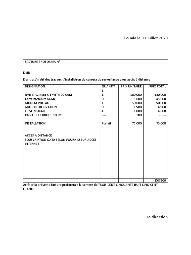 Elle indique le prix la description des produits ou du service et saccompagne souvent des conditions générales de ventes. Il faut voir ce document commercial comme un devis officiel présenté sous forme de facture. La facture pro forma est à mi-chemin entre le devis et la facture.