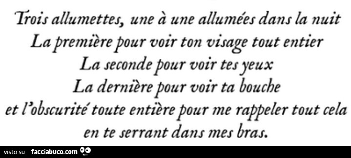 Tre fiammiferi accesi uno per uno nella notte Il primo per vederti tutto il viso. Trois allumettes une à une allumées dans la nuit La première pour voir ton visage tout entier La seconde pour voir tes yeux La dernière pour voir ta bouche Et lobscurité.